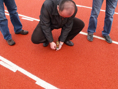 分別將兩個籃球架按預埋尺寸放置至預埋坑中(籃球架上標有預埋線),然后倒入混泥土,并用水平尺測量好籃球架體的前后左右的垂直水平。