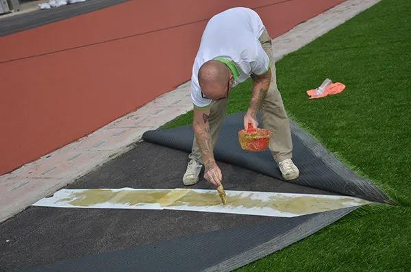 接下來就是把人工草坪用粘貼帶逐個(gè)的進(jìn)行粘貼,使用專門的馬貝膠水對(duì)草皮進(jìn)行鋪設(shè),然后還有進(jìn)行平整的擠壓,使其盡快的粘貼,中間不留痕跡,同時(shí)還有就是不同板塊的草坪之間進(jìn)行銜接,標(biāo)準(zhǔn)的要求是不能超過3mm。縫隙太大,在使用的過程中可能會(huì)產(chǎn)生很多的事故并且嚴(yán)重的情況下會(huì)危害運(yùn)動(dòng)員的職業(yè)生涯。