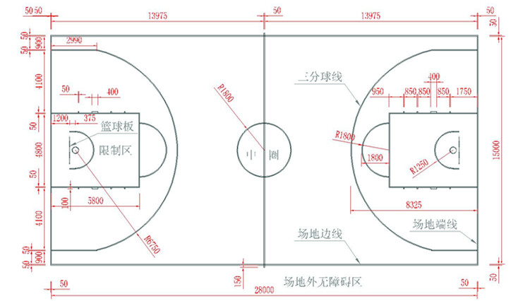 3 籃球場(chǎng)劃線及其尺寸要求: